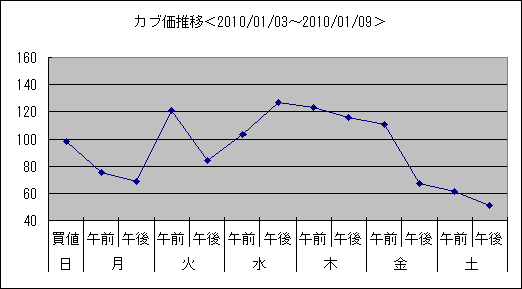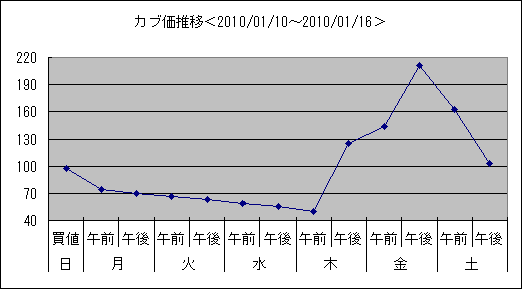 こちらは2010/01/10~2010/01/16のカブ価グラフ。今回久方ぶりの「高騰」。