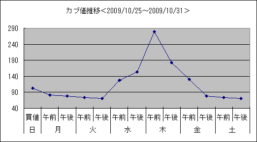 こちらは2009/11/01~2009/11/07のカブ価グラフ。今回は「ジリ貧」。
